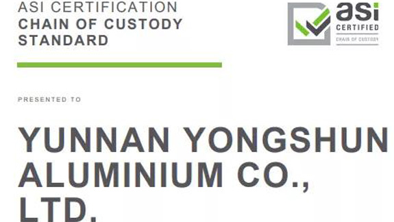 雲南湧順鋁業有限公司通過ASI監管鏈標準認證